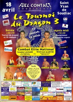 FULL CONTACT ST YZAN DE SOUDIAC LE 18 AVRIL 2009 A 20HOO . TOURNOI DU DRAGON3 , 12 COMBATS EN SOIREE COMBATS ELITE NATIONAL AVEC UNE DEMO DU VOVINAM VIET VO DAO DE GUITRES