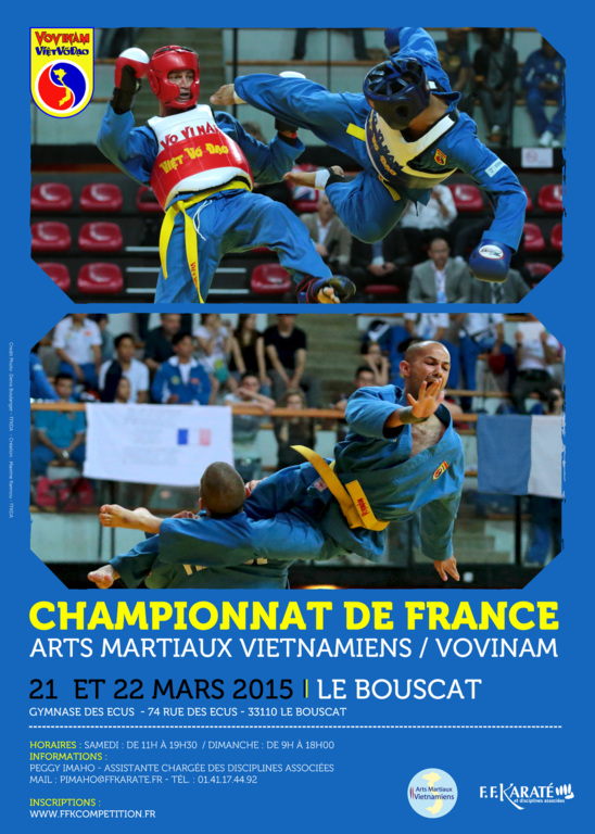 le championnat de France de Vovinam Viet Vo Dao aura lieu au gymnase des Ecus situé au 74 rue des Ecus 33110 LE BOUSCAT du samedi 21 au dimanche 22 mars 2015.